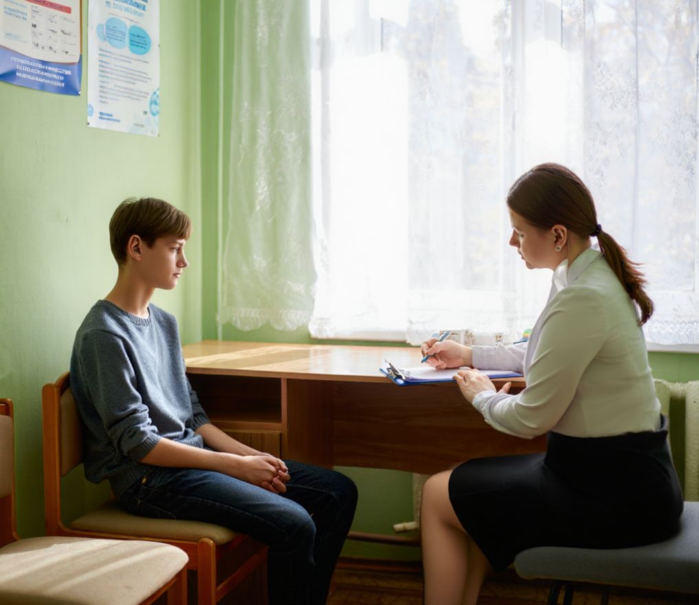 Подросток на приеме у психолога в кабинете
